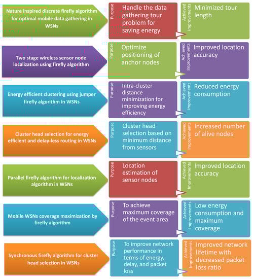 Firefly algorithm low complexity among other metaheuristic algorithms has attracted much attention in the last decade []. The minimum computation cost of the firefly algorithm in terms of time has led to its adaptation in various applications, including digital image compression [], antenna design [], traveling salesman problem [], security [,,] and multi-modal optimization []. In the WSNs, firefly algorithm has also been adapted for handling different problems such as node localization [,], energy-efficient data collection [] and cluster head selection [,,]. From the contributions brought by the firefly algorithm in WSNs, we comprehend that the incorporation of a bio-inspired firefly algorithm in IBNNs ensures a higher probability of achieving low-complexity energy-efficient data routing. In Figure 1, we have further emphasized the impact of the firefly algorithm in improved WSNs performance that is further paving the way for its adaptation in IBNNs.