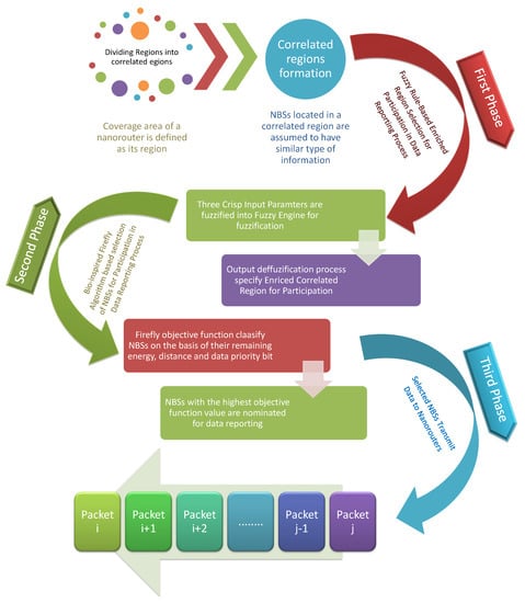 In this section, we proposed a fuzzy logic and bio-inspired firefly algorithm based routing scheme. The main objective of our proposed scheme is to increase the probability of enriched information transmission while maximizing the lifetime of implanted NBSs. Our proposed scheme realizes the goal of energy-efficient data routing by dividing the data transmission process from NBSs to nanorouter into three different phases, briefly explained in this section. Furthermore, Figure 2 also elaborates on the complete working of our proposed scheme.