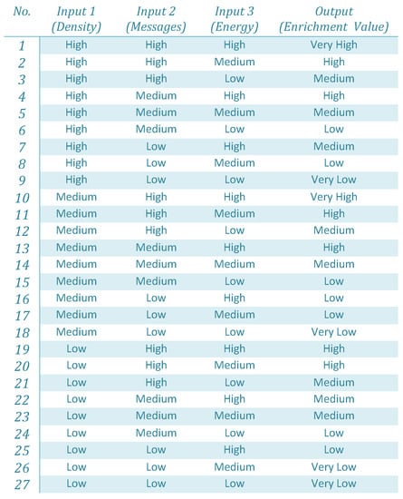 - Fuzzification: In our proposed fuzzy logic-based decision model, the input and output parameters are described using the linguistic variables. The expressions used for input parameters, density, messages and energy are ‘high’, ‘medium’ and ‘low’, respectively. While the output parameter represents the enrichment value using the linguistic variables ‘very high’, ‘high’, ‘medium’, ‘low’ and ‘very low’. In the fuzzification process, these variables are represented by triangular membership functions, which are used to associate a grade to each input linguistic variable. The selection of the number of membership functions and their initial values is based on process knowledge and intuition. The membership function has a value between 0 and 1 over an interval of the crisp variable.