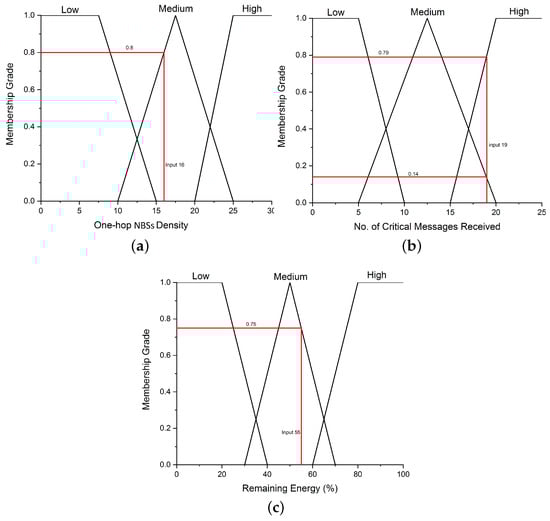 Input variables for performing fuzzification. (a) Input variable “density” for fuzzification. (b) Input variable “messages” for fuzzification. (c) Input variable “energy” for fuzzification.