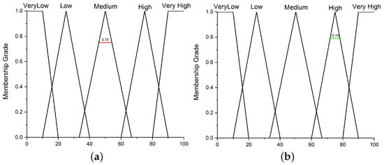 Mamdani Rule evaluation process for crisp input values of x = 17, y = 19 and z = 55. (a) If x is 0.8 (medium), y is 0.14 (medium) and z is 0.75 (medium) then the output w is 0.75 (medium). (b) If x is 0.8 (medium), y is 0.79 (high) and z is 0.75 (medium) then the output w is 0.79 (high).