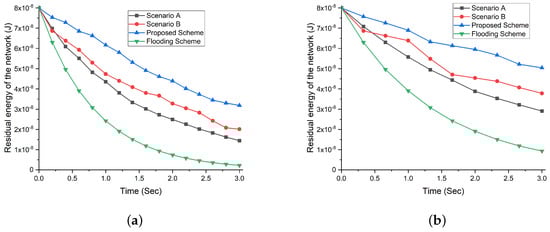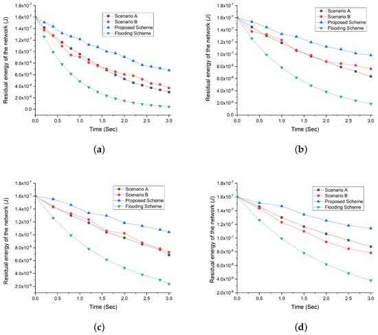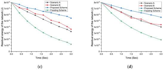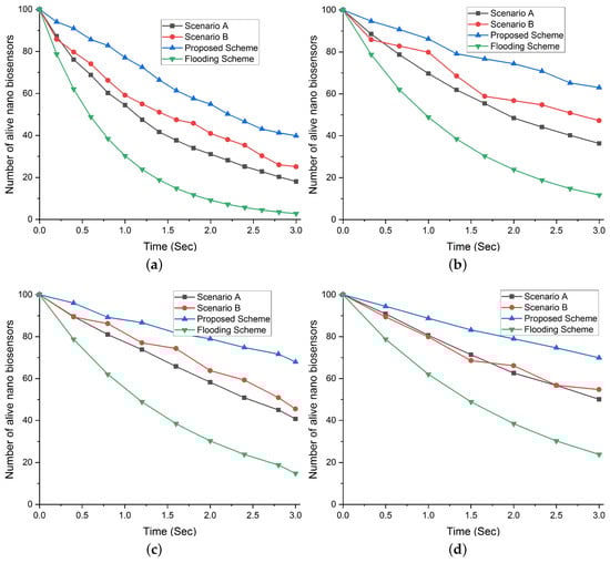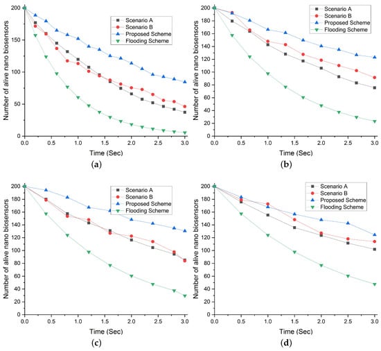 Figure 9 clearly depicts that the maximum number of alive NBSs are obtained for the 0.5 request rate interval. Since at interval 0.5, requests are generated at the minimum number. Our proposed scheme achieves the maximum network lifetime due to our selection strategy that balances the message generation load among all the NBSs. In addition, the selection of NBSs based on the their fitness value also supports in preventing energy consumption in those NBSs that have low remaining energy. While Flooding scheme results in a minimum network lifetime for all the intervals due to the involvement of all the NBSs. From Figure 9a–d, it is evident that scenarios A and B do not provide improved network lifetime alone, without combining them to achieve the goal of maximum network lifetime.