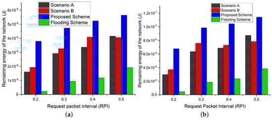 Total remaining energy in the network comparison of proposed scheme with flooding scheme and different scenarios (A and B) with respect to increasing request rate interval and NBSs density of 100 and 200. (a) Total remaining energy in the network with respect to increasing request rate interval and NBSs density of 100. (b) Total remaining energy in the network with respect to increasing request rate interval and NBSs density of 200.