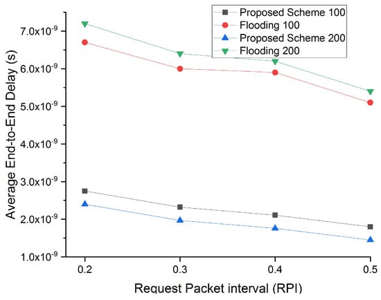 Average end-to-end delay comparison with flooding scheme with respect to increasing request rate intervals and NBSs density of 100 and 200.