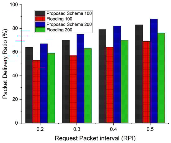 The successful reception of the maximum number of packets leads to increased packet delivery ratio. The packet delivery ratio is assessed with respect to different request rate intervals to highlight the impact of request rate intervals on the packet delivery ratio.