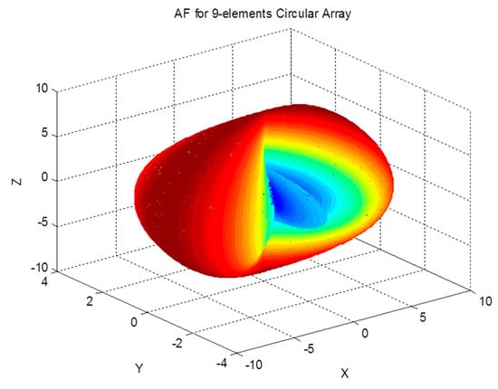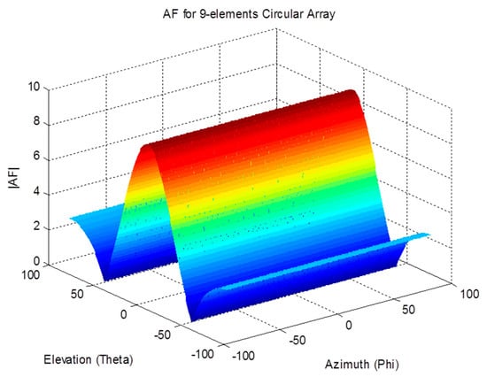 The array factor for a circular antenna array is a function of both spherical angles; therefore, it can filter the received signals based on their azimuth and elevation angles. The effect of the array on the received signal as a function of the angle of arrival can be demonstrated by examining the array factor. The magnitude pattern of the circular array factor is shown in Figure 4, Figure 5 and Figure 6. This pattern is drawn for a circular array of nine elements that are equally spaced on a circular circumference with a radius of . The circular arrays configuration does not have the edge effect. It is clear from the AF magnitude shown in Figure 6 that the circular array response is symmetrical around the elevation direction, which enhances the capabilities of circular antenna arrays in beam steering.