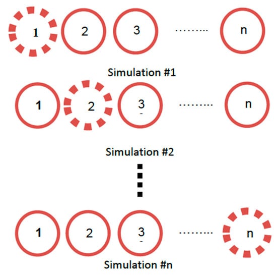 Referring to [37], one radio frequency (RF) front end and a single RF output Spirent GSS6700 simulator running SimGENTM software are utilized to verify the proposed method. Initially, the desired experimental parameters such as the number of antenna elements, array geometry, GPS signal frequency (i.e., L1, L2 and L5), and consequently antenna element spacing are defined. Upon designating the zero-phase element’s (reference element) location in terms of latitude, longitude, and height, the remaining elements of the array are mapped according to the predefined experimental configuration. Once the locations of all the antenna elements are set, a simulation scenario is created using the simulator software. The simulator software enables the reiteration of the simulation scenario without changing any parameters except for the location of the antenna element in 3D space. Figure 8 illustrates the simulation sequence for a given M-element array, where each iteration corresponds to one of the array elements where .