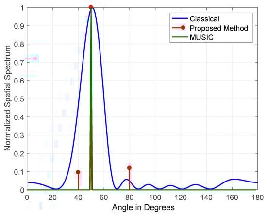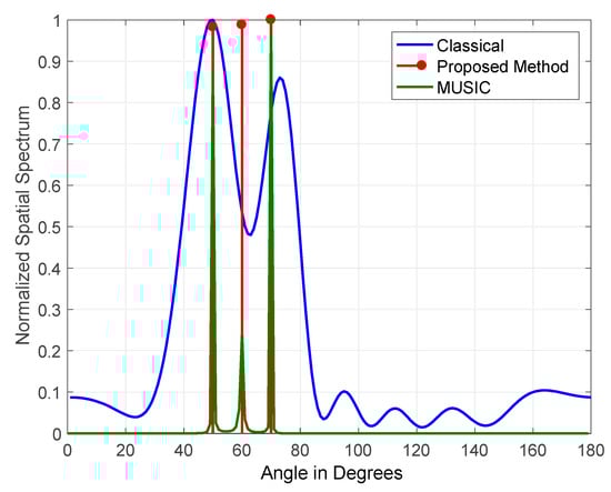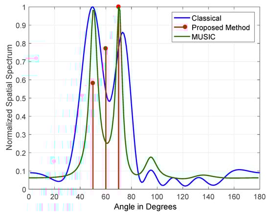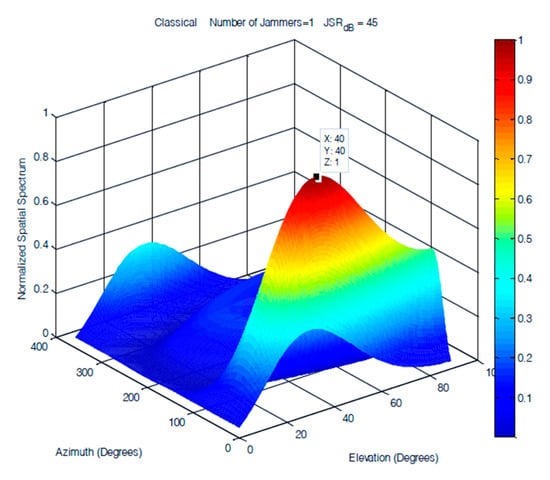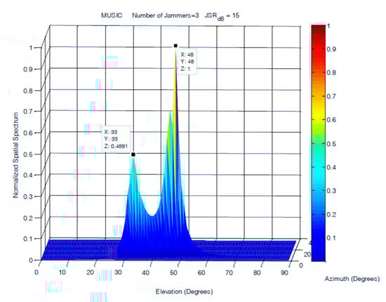 The results obtained for three jammers arriving at elevations of (50°, 60° and 70°) JSRs are shown in Figure 11 and Figure 12. The figures indicate the normalized output for classical DOS estimation, MUSIC, and the proposed DOA estimation methods. The JSRs of the jamming signals used in Figure 11 and Figure 12 are 15 and 45 dB, respectively.