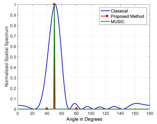 Capon’s beamformer, also known as the minimum variance distortionless response (MVDR), attempts to improve the drawbacks associated with the classical method and yield a significant improvement [19]. The output power is minimized while constraining the gain in the necessary direction to unity. The MVDR method requires an additional matrix inversion compared to the classical method. Fortunately, it outperforms the conventional method in most cases. The disadvantages of the MVDR method are the necessary other computations and the failure to estimate the DOAs of highly correlated signals [20].