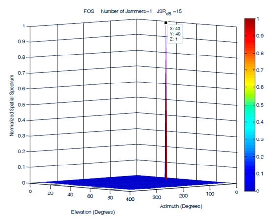 Direction of arrival (DOA) estimation of one jammer at a JSR = 15 dB.