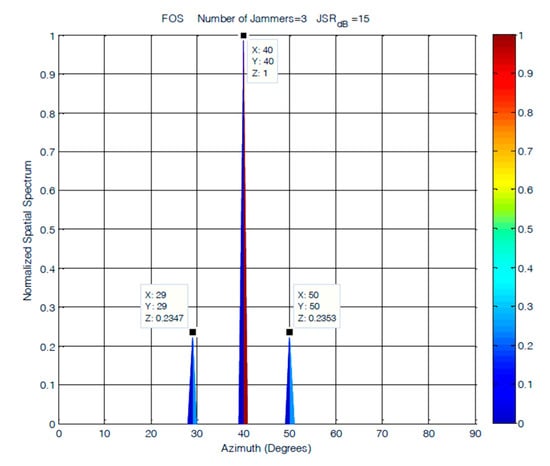 The results shown in Figure 17 showed steady performance for FOS in terms of the resolution and number of detected jammers for the cases where the JSR was 15 dB. The degradation in FOS was observed in its allocation of power to jamming signals, as it was not accurately allocated for jammers arriving at a JSR of 15 dB. The increase in the level of noise affected FOS performance and caused most of the power to be allocated to the jammer arriving at 40°. MUSIC had much lower accuracy in power allocation for the three jamming signals. The degradation in MUSIC performance was more evident at lower JSR ratios, where MUSIC was able to detect only two jamming sources, as shown in Figure 16. The accuracy of the detected DOA elevation and azimuth of jamming signals at 15 dB JSR are close for both FOS and MUSIC, as shown in Table 1, with a slight increase of 1° in the error of jamming signals detected by MUSIC.