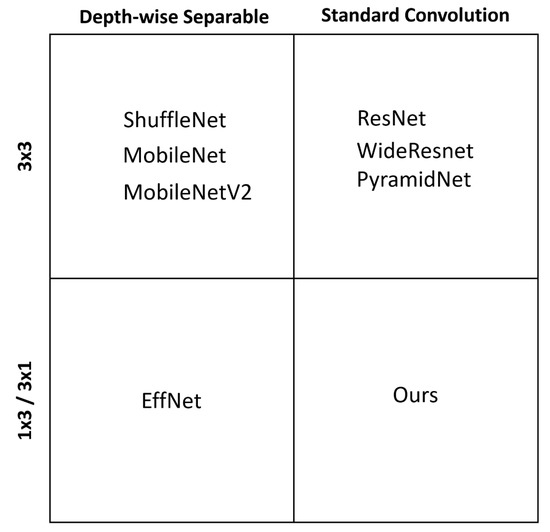 The motivation behind MobileNet [3] illustrated in Figure 2 was to reduce the network computational cost by using 3 × 3 depth-wise separable convolutions. Specifically, a depth-wise separable convolution is a form of factorization which reduces computational cost in comparison with a standard convolution. A more comprehensive comparison between a normal convolution and a depth-wise separable convolution is provided in Section 1.2. The study in [3] showed a drawback when evaluated with ImageNet, i.e., the performance of MobileNet decreased by 1%, but the advantage was a substantial reduction in computational cost in comparison with those of the model with a normal 3 × 3 convolution.