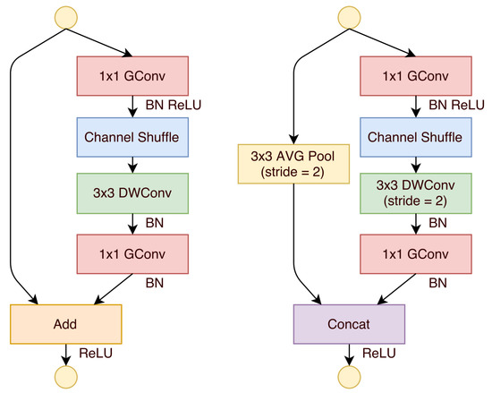 ShuffleNet [4], as illustrated in Figure 3, uses two new operations, i.e., a point-wise group convolution and channel shuffling. A 3 × 3 kernel was used for the depth-wise portion of the depth-wise separable convolution operation to reduce computational cost. The motivation of using a shuffle was to combat pitfalls in group convolutions. Specifically, if multiple group convolutions stack together, output channels are only derived from a small fraction of input channels which impacted performance. Shuffling the channels overcame this problem and led to performance improvements over MobileNet. However, this additional operation, i.e., shuffling, is also a drawback, as it leads to additional computation.