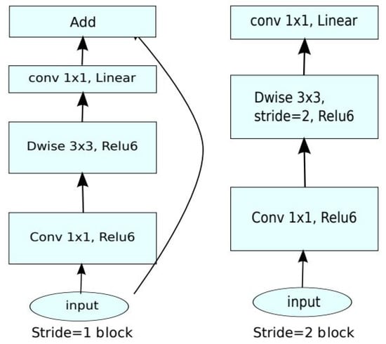 MobileNetV2 [6], as illustrated in Figure 4, builds on the original MobileNet architecture using 3 × 3 depth-wise separable convolutions but with the addition of an inverted residual structure where shortcut connections are used between thin bottleneck layers to reduce input and output sizes. This model outperformed the state-of-the-art networks such as MobileNet and ShuffleNet, at the time for the evaluation of ImageNet.