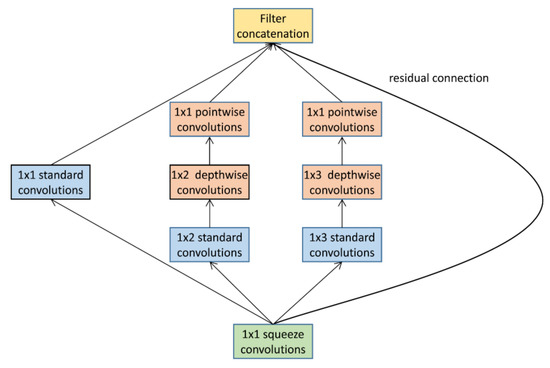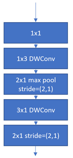 LiteNet [20], as illustrated in Figure 5, takes an inception block which contains 1 × 1, 1 × 2 and 1 × 3 standard convolutions arranged side by side and makes modifications (inspired by MobileNet) by replacing half of the 1 × 2 and 1 × 3 standard convolutions with their depth-wise equivalents. Their proposed block, therefore, contains a mix of both standard and depth-wise separable convolutions. Their work also makes use of a SqueezeNet fire block [21] to further reduce the total network parameters. The model was trained on the MIT-BIH electrocardiogram (ECG) arrhythmia database [22] and improved the accuracy rate against baseline models of ≈0.5%. The drawback of their proposed model is the side-by-side structure employed, since side-by-side blocks increase the total number of parameters for a given depth. The inception model originally proposed a side-by-side block to reduce the need to select appropriate filter sizes upfront. By including a variety of different filter sizes side by side, the network could learn which ones are best to use. We have since learnt in related works that the most common filter used is 3 × 3 and deeper models perform better. Therefore, our model eliminates their constraint by focusing on one filter size.