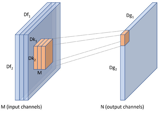 The depth-wise stage uses a kernel k which spans only one channel of input f. M such kernels are used to span the entire depth of the input to produce an intermediate output g of size as shown in Figure 8.