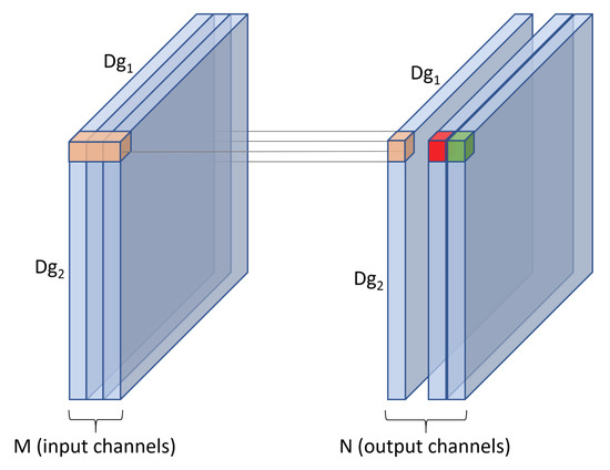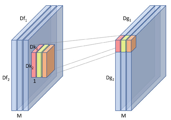 For an input f of size , a standard convolution uses a kernel k which extends the entire depth of the input. The kernel therefore has a size of . Convolving k with input f produces an output g of size as seen in Figure 7.