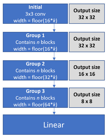 The width within our model is controlled with a widening factor of k. The first block of each group is responsible for increasing width. The initial 3 × 3 convolution has a width of . Group one has a width of , while group two has a width of , and group three has a width of . Except for the initial 3 × 3 convolution, these settings were taken from related studies of [14].