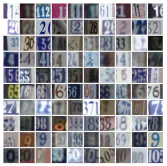 The SVHN data set [8] contains house numbers obtained from Google Street View images. It is divided into 73,257 training and 26,032 test images. We used a 32 × 32 crop of the original images which produces a MNIST-like data set. In this format, each image contains one digit of interest belonging to one of 10 classes, i.e., a number between 0–9, along with some distracting digits in both sides of each image. Some example images in the SVHN data set are shown in Figure 13.