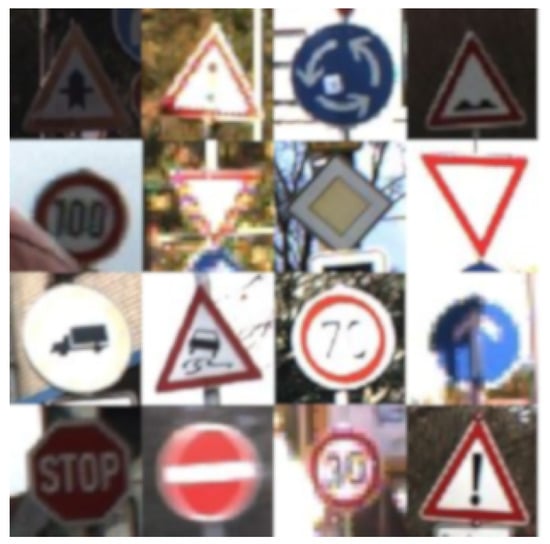 - Stallkamp, J.; Schlipsing, M.; Salmen, J.; Igel, C. The German Traffic Sign Recognition Benchmark: A multi-class classification competition. In Proceedings of the IEEE International Joint Conference on Neural Networks, San Jose, CA, USA, 31 July–5 August 2011; pp. 1453–1460. [Google Scholar]