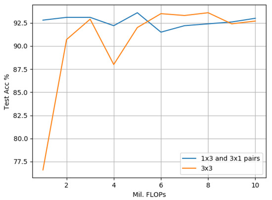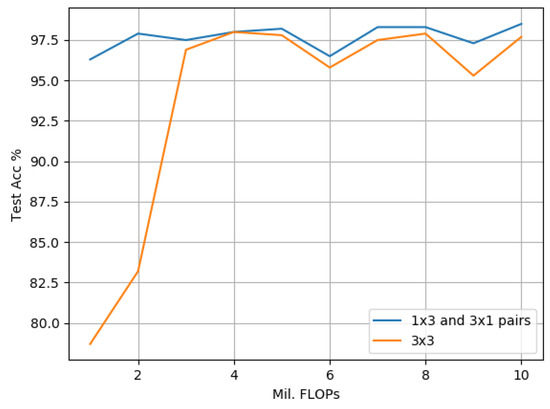 To prove the effectiveness of our proposed architecture against a scaled-down state-of-the-art model based on the popular 3 × 3 standard convolution, we construct a 3 × 3-based model by replacing our 1 × 3 and 3 × 1 pairs with a 3 × 3 convolution for comparison. We then scale our proposed model and its 3 × 3 standard convolution counterpart to contain between 1 to 10 million FLOPs. The 3 × 3 configuration closely resembles scaled-down variants of popular models proposed by [13,14]. With some minor alterations to the width calculation, it would also resemble the architecture proposed by [16]. We train both models on CIFAR-10, SVHN and GTSRB data sets as discussed earlier.