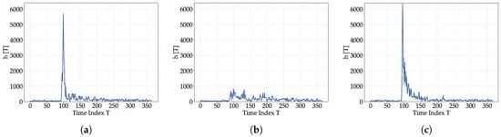 While the simplified models introduced in Section 3 only cover a part of the actual propagation effects, they show that, apart of the ToA (which, usually, corresponds to the time of the first correlation peak above a certain threshold), a lot of additional spatial information related to the environment is contained in CIRs. While this information has been used by deep neural networks and using complete CIRs [,], this article proposes a more compact and comprehensible representation of the information by feature extraction. In the following, some approaches to represent this information are identified. In this section, the features are introduced and calculated for a set of three CIRs with different properties (LOS, NLOS, and multipath), as shown in Figure 1. The CIRs were collected with the measurement setup described in Section 5.1.1. The recording hardware setup did not allow for a representation of the CIRs in physical units, which also holds for the extracted features. This is not an issue for the proposed positioning approach, as it includes the normalization of the features. Hence, throughout the discussion of the evaluation and results, graphs my not explicitly denote physical units or units at all. The magnitudes of the obtained signals are presented. While the two CIRs with a LOS component (Figure 1a,c) exhibit a clearly identifiable peak (at T = 100), the CIR without a LOS connection (Figure 1b) does not. The LOS CIR with multipath components (Figure 1c) has a exponentially decreasing tail of early reflections at  (similar to the model presented in Equation (6)) after the LOS peak, while, for the pure LOS CIR (Figure 1a), a much steeper decay is present. In the following, the used features are described, starting with simple basic ones (Correlation Maximum and Energy), followed by more sophisticated features related to energy decay (Decay Time Index and Peak Decay Exponential) and windowed features (time–frequency features and echo densities).
