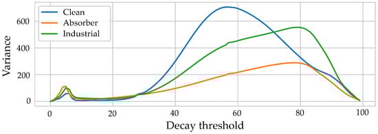 where  denotes the end of the impulse response. It has been studied in audio signal processing [] and is usually used in connection to the reverberation time  [], a useful parameter for echo cancellation and other audio applications. For a compact representation of the EDC as a single feature, different characteristic values were extracted. Suitable percentiles were obtained by examining the statistical distribution of the EDC percentiles within a given dataset. The percentiles corresponding to the greatest variance in the distribution of the features were chosen by calculating the variance of the EDC in 1% steps. Figure 2 shows the resulting variances for the three datasets (Clean (pure LOS), Absorber (systematic reflections and absorptions), and Industrial (realistic environment)) that are described in detail in Section 5.1. A value of 78% resulted in the highest variances for the scenarios with more complex propagation patterns (i.e., a scenario with systematically introduced reflections and absorption and a realistic industrial environment). The peak for the clean scenario was not included, as, apart from the LOS components, no spatial information is present, such that the energy decay is mostly dominated by spatially uncorrelated noise.