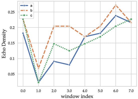 The echo density profile has been introduced as a method to characterize different reverberant environments with respect to their geometry and the presence of scattering objects in audio signal processing []. It is given by the number of values outside the standard deviation within a sliding window