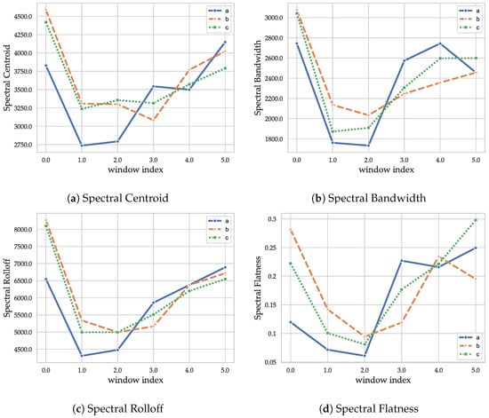 Representing the CIRs in the frequency or time–frequency domain is also a promising way of extracting the contained information. The assumption is that the overlapping windows of the time-frequency domain representation contain information on the different phases of signal propagation contained in the CIR, which should reflect in the frequency domain. For example, if a signal has dominant early reflections, the tonality in the corresponding windows is higher. For this, the librosa library [] was used for feature extraction. The features are calculated on the spectrogram of the CIRs, which is a time-frequency representation containing the squared magnitude of the short-time Fourier transform. This turns the signal into a set of frequency domain windows of specified length that each represents the spectral information within a short time interval. A Hann window of size of 128 with an overlap of 64 allowed for capturing the spectral information on the different characteristic phases in the impulse response. These settings present a trade-off between time-frequency resolution and compactness. The following features were evaluated (formal definitions of the spectral features are omitted for conciseness): the spectral centroid (SCD), corresponding to the center-of-mass of the spectral representation; and the spectral bandwidth (SBW), describing the frequency range of the majority of the signal. The spectral flatness (SFL) was also chosen, which is a measure of the atonality of the signal, i.e., the flatter is the spectrum, the more noise-like is the signal. Furthermore, the spectral roll-off (SRO) corresponds to the frequency below which the majority of the energy is contained.