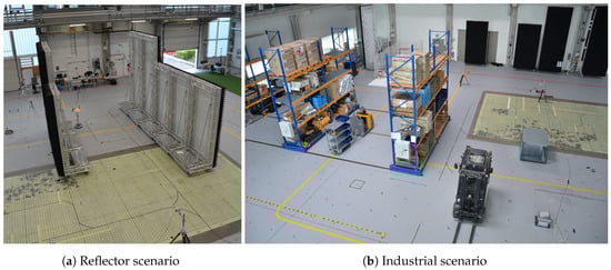 For collecting the CIR data, a hardware module containing the decawave chip DW1000 using impulse radio UWB technology with adjustable center frequencies between 3.5 and 6.5 GHz and bandwidths between 0.5 and 1.3 GHz was employed. The chips can be configured as transmitters and receivers, dependent on the installed firmware. In total, eight tags were available of which 6/7 were used as infrastructure tags and one as a mobile tag. The mobile tag was configured as a receiver for the dataset used in Section 6.3 and as a transmitter for the other evaluations (the opposite holds for the infrastructure nodes). For the large-scale datasets used in Section 5 and Section 6.2, the Nikon iGPS system (with a positioning accuracy in the range of millimeters) was used as a reference system and synchronization of the CIRs and reference data was done by transmitting the data to a global server over a TCP/IP protocol.