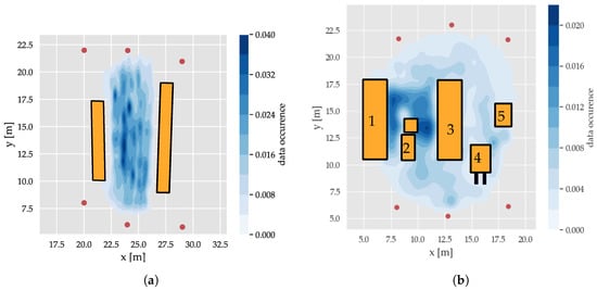 For the spatial analysis of the features in relation to the environment, three datasets of about 50,000 CIRs per infrastructure tag (i.e., anchor or node) were recorded. First, a dataset in a free-space environment was collected in an area of about 5 m × 10 m. After that, in the next measurement, reflections and absorptions were systematically introduced using absorber/reflector (a/r) walls, leading to a reverberant environment with predictable multipath propagation, shown in Figure 5a. The final large-scale dataset represents a realistic industrial environment on an area of [14 m × 18 m], including large metal shelved filled with goods and industrial vehicles, as depicted in Figure 5b. The measurements were conducted by walking within the region with the transmitter for an extended period of time, as depicted in Figure 6. The distributions of data occurrence for the different datasets are shown in Figure 6: For the industrial scenario, the data collection focused on the area between the two storage shelves (objects (1) and (3) in Figure 6b) as this area had the most complex arrangement of interfering objects. In the case of the reflector dataset depicted in Figure 6b, data collection was focused on the area between the r/a walls and the transitions to the outer side to capture data with distinctive propagation channels.