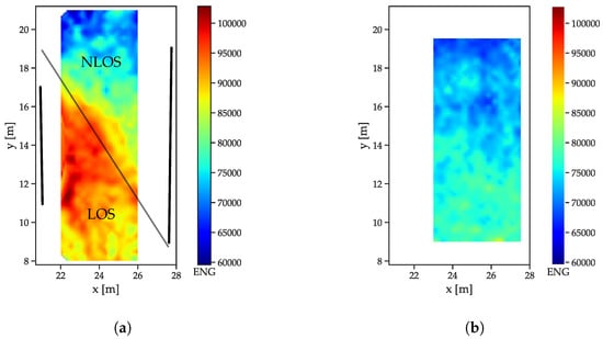 To compare the behavior of LOS/NLOS CIRs, two large scale datasets (see Section 5.1) were used: the free-space scenario and the dataset with the reflector/absorber (r/a) walls: The arrangement of the absorber walls was chosen such that, for each of the infrastructure tags, parts of the LOS signals was absorbed and CIRs both with and without MPCs were available. The r/a walls, as  shown in Figure 5a, have a metal plate on the reflector side, with some metal mechanical arrangements towards the bottom side that cause some perturbation. Both scenarios were recorded with the same receiver setup, but in a slightly different area, such that, for the free space scenario, enough data for interpolation were only available in an area shifted 1 m in the positive x-direction. All feature distributions are shown for a receiver located at (29 m, 5.8 m). The energy distributions (Figure 7a) show that the LOS path yields a much higher amount of energy than the NLOS components (Figure 7a), as indicated by the drop-off in energy. The fact that separation between the LOS and NLOS areas is not a straight line is due to diffraction at the edges of the reflector/absorber walls (marked as thick black lines). Furthermore, the reflections, especially at the left absorber wall, cause a much higher energy content in the CIR, especially close to the wall and where the reflections are present in addition to the LOS component. The free space CIRs exhibit a much more homogeneous energy distribution (Figure 7b), with the energy, slowly decreasing with the distance to the receiver (and therefore with the size of the correlation peak that can be assumed to be the main contributor to the overall energy).