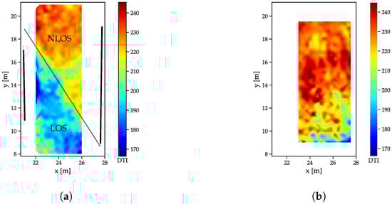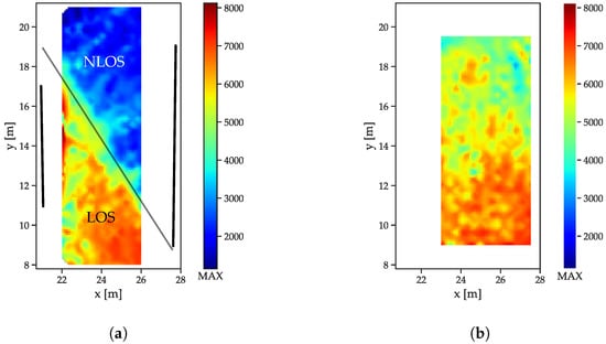 The correlation maxima (Figure 8) exhibit an even more distinguishable difference between LOS and NLOS CIRs: while the outcomes of the LOS CIRs decrease radially with the distance, a sharp distinction occurs between the areas affected and unaffected by the absorber wall (Figure 8a).