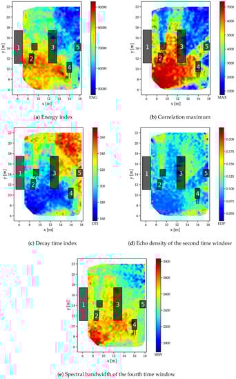 The effect of the missing LOS is even higher for the correlation maxima (Figure 11b) so that even the small vehicle (2) has a distinct “shadow” caused by the lack of a direct signal path with blocking objects in the LOS. The decay time index Figure 11c also increases in areas with objects causing multipath propagation, such as between metal shelfs (1) and (3) and, especially behind metal shelf (3), where it can be assumed that no or only a strongly attenuated LOS signal component is available.