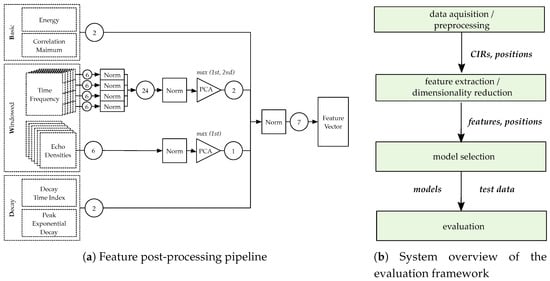 The evaluation setup is depicted in Figure 12b: First, the collected data were pre-processed. Samples that did not contain CIRs from all receivers/transmitters were discarded as they could not provide complete feature vectors (amounting to about 20% of the data). Then, the recorded data, containing CIRs from all infrastructure tags, reference positions, and timestamps, were aligned such that a matrix of CIRs , and corresponding reference positions  was available. Afterwards, this set of labeled data was then processed into the feature extraction and post-processing framework. The features were prepared for use in solving a classification problem. We split the set of proposed features sets into three different categories: Basic, Windowed, and Decay. B contains a single energy index (ENG) and a single correlation maximum (MAX) feature. W compromises both the time–frequency (SCD, SBW, SFL, and SRO) and echo density (ED) features. There were 24 time–frequency features, four different groups of six features each, and  six ED features. D includes two features: the Decay Time Index (DTI), and the Peak Decay Exponent (PDE). The process for creating the final feature domain representation is shown in Figure 12a. First, all the time–frequency domain features were normalized separately as the value ranges of their outcomes varied greatly. Then, the features were normalized together. The six ED features were also normalized.