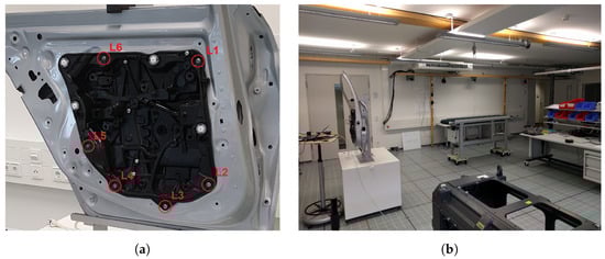 Pictures of the test environment for the small-scale datasets. (a) The location of the positions-of-interest (L1–L6) on a car door. (b) The environment for the small-scale dataset.