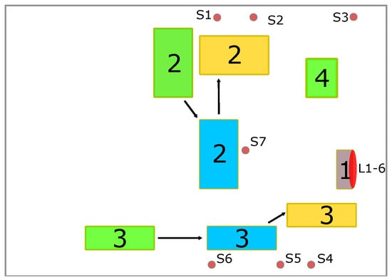 Thus, if the model correctly classifies that the obtained signal originates from inside the red box in Level 0, another model that classifies the regions at Level 1 can be applied. This process can then be repeated until Level 4 is reached, which represents an accuracy of 14 × 75 cm, about the size of a typical work piece (localization of production steps on a work piece see Section 6.3). In Figure 6b, the distribution of collected data is shown. The area in between the storage shelves was selected, as it exhibited the highest data density and a high structural complexity. However, at Level 4, only about 100 data points per class were available.