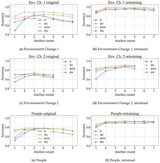 Classification accuracies for different anchor counts for testing with the datasets including environment changes. The results in the left column are without, in the right column with retraining.