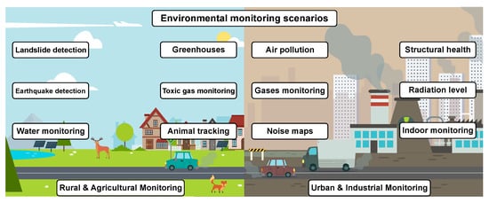 Focusing mainly on the Smart City paradigm from the IIoT perspective, the main activities of environmental monitoring could be listed as the following [] (see selected ones in Figure 1). The first group of applications corresponds to the paradigm of urban environmental monitoring []. It consists of the following subgroups: (i) structural health []; (ii) light pollution monitoring []; (iii) waste management []; (iv) noise monitoring []; and (v) air pollution [].