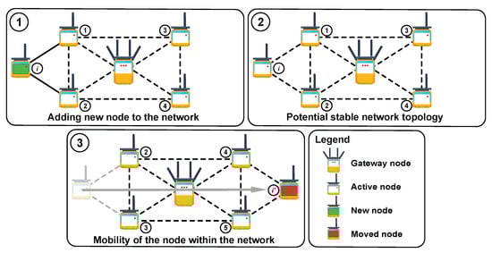 - Stable sensor network operation: In this scenario, sensors are neither added nor excluded from existing topology, and their logical position is static with respect to their neighbor nodes (see Figure 2, Case 2).