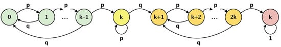 We developed a Markov chain model (see Figure 3), describing the failure process of a series of sensor nodes with k overlapping connections shown in Figure 4. If a node has failed (with probability p), we make a transition to the right on the Markov chain, but if the node has not failed (with probability ), we make the transition to the left. To isolate a group of nodes in the presence of “k-extra” connections, k consecutive nodes must fail on both sides of a group. It can be represented as a stochastic counting process that moves to the next state if it encounters a failed node and returns to the initial state if it encounters a working node.