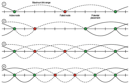Potential node placement strategies: solid line, active link; dashed line, disrupted link.