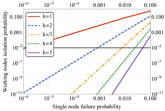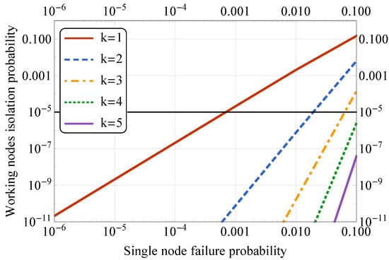 In the first scenario, we focus on the mesh operation between two public transport stops, and the results are given in Figure 5. Here, both axes have a logarithmic scale. Here, the horizontal black line represents the overall system reliability equal to %, and we vary the probability of a single node to fail, thus, eliminating at least two links between the neighbors. By increasing k value, we introduce a higher number of additional links, as shown in Figure 4, which decreases the probability of the network segment separation. Following the overall reliability requirement, we can conclude that having almost reaches the required threshold and thus could be used for the actual system deployment. Therefore, the sensors could be placed at three out of five lighting poles for the node reliability of 99% per 10 years operational time.