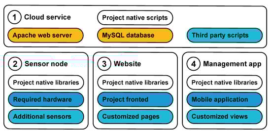 In this section, we describe our custom platform, which was developed aiming to improve the process of secure monitoring IoT system development ease and is based on the REpresentational State Transfer (REST) principle. Additionally, this platform improves the initialization process by the automated distribution and visualization of the node location on the map. The developed platform is a set of components allowing to build IoT solutions based on Atmel ATmega328P controller [] equipped with wireless ESP8266 module []. The primary platform segments are: (i) firmware (binary image for ESP8266 chip); (ii) Android software (Java libraries and sample applications); (iii) web software (JavaScript library and sample pages); (iv) server-side services (user interface, data processing scripts, and database access scripts); and (v) database (MySQL). Their relations are highlighted with the same colors in Figure 7.
