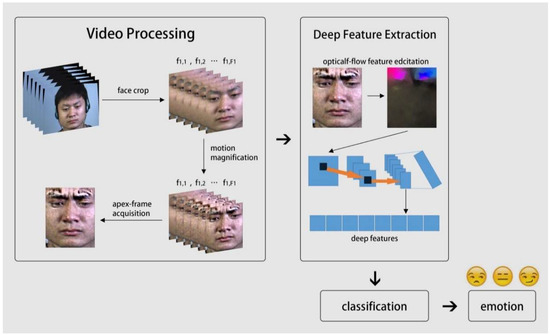 Compared to traditional ME feature technologies based on manual extraction [3,4,5,6], deep networks have more powerful data fitting ability and more adaptable to the motion characteristics of ME sequences. Traditional expression recognition methods based on deep learning serve to input ME images or related optical flow feature maps directly into the network [19,20,21]. It is difficult for the network to distinguish the emotional categories of MEs because of their subtlety and similar muscle contraction units. In this study, we input the optical flow feature map of the ME sequences disposed by EVM into a CNN—this allowed us to secure a network that effectively judges ME motion characteristics and makes the extracted higher-level features more discriminative. The scope of MEs was also extended from six basic emotional categories to 18 compound emotional categories. This method accurately describes the emotional states encountered by individuals, and makes ME recognition more practical on the whole.