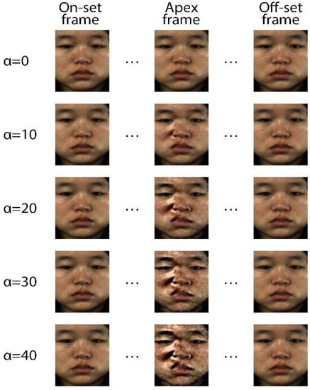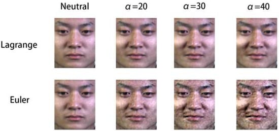 Furthermore, we compare the movement results of the same emotion “adjust” according to different magnification factor , as shown in Figure 6. The results show that when , we could not clearly observe the facial movement information as the MEs were still too subtle, and the magnification coefficient was not sufficient to reflect motion in the face. When , the overall effect was ideal and there was little noise interference. When , the effect of noise was clearly observed but it still within an acceptable range. At magnification factor of 40, noise severely affected the visual effect and the facial image was distorted. The EVM method can be used to effectively avoid noise while enlarging the facial motions though distortion does occur once the magnification reaches a certain threshold.