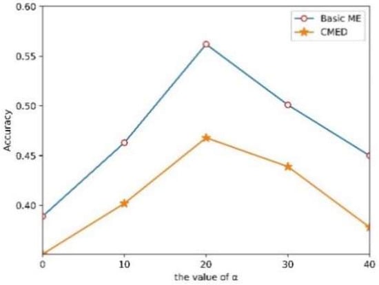 Firstly, we adjust the resolution of basic and compound ME images to 150 × 190 according to the above experiments. Secondly, we set the parameters of the EVM method for enlarging the subtle motions. Both Laplacian pyramid and Gauss pyramid can be used for spatial filtering. The resulted show that this article needed to enlarge the muscle movements corresponding to MEs, so we chose the Laplace pyramid to construct the baseband of different spatial frequencies. Similarly, time-domain filtering can select different bandpass filters according to different requirements. Therefore, we chose the Butterworth band-pass filter because the time-frequency analysis of the amplification results is not necessary after the amplification motion. The motion range of MEs is very subtle, so too small magnification factor does not reflect the contraction of muscles. However, if is too large, the image distortion and noise caused by the camera may lead to the decline of experimental accuracy. As shown in Figure 9, we compared the effects of different amplification coefficients on the experimental accuracy in basic ME database and CMED. In this experiment, we only input the enlarged images of MEs into CNN, and the results show that is the appropriate magnification.