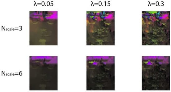 Figure 11 shows the optical flow feature maps corresponding to different λ and of the emotion “disgust” in the CASME II database. When λ = 0.3, the influence of optical flow constraints is large. The TV-L1 optical flow algorithm is very sensitive to noise, which leads to optical flow graph instability. The small displacement and noise produced by the camera makes these unnecessary movements particularly obvious under this condition. The motion amplitude of MEs is so slight that cannot detect the muscle contractions, resulting in inaccurate motion representation on the optical flow map.