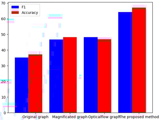 In order to prove the effectiveness of the proposed algorithm, we input four different feature images (original graph, magnified graph, optical-flow graph and the proposed method) into CNN and get the histogram as shown in Figure 12. The experiment indicates that this algorithm not only enlarges the subtle muscle movements of MEs on the image-display level, but also extracts the optical flow features, which provides a more accurate and robust image basis for subsequent depth feature extraction and recognition.