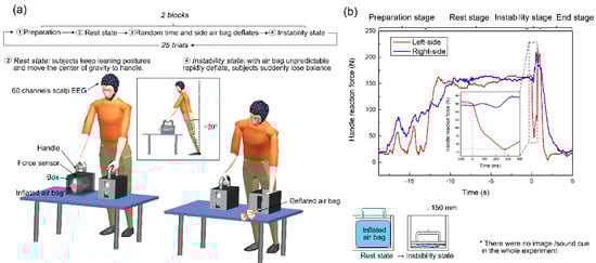 Figure 1a showed the experimental paradigm and equipment in this study. The experiment equipment consisted of an inflatable airbag that could exhaust rapidly, a handle that moved up-down when the airbag inflated and deflated, a force sensor connected to both the handle and the airbag, and also a box used to contain the devices described above. The participants remain on the rest state for a random period between 5 to 15 s and then suddenly switch to the instability state by random side of airbag deflation. During the rest state, the airbag was fully inflated, and the subjects kept a stable standing while leaning forward approximately 20 degrees, and moved the center of gravity towards the handles (simulating walker-assisted standing of SCI individuals). In the instability state, one of the two handles (randomly selected) will rapidly move down, simulating falling due to deflation of the airbag (which takes maximum to 300 ms). The subject lost balance as the support force of one of the upper limbs decreases rapidly. The experiment performs 50 events per subject.